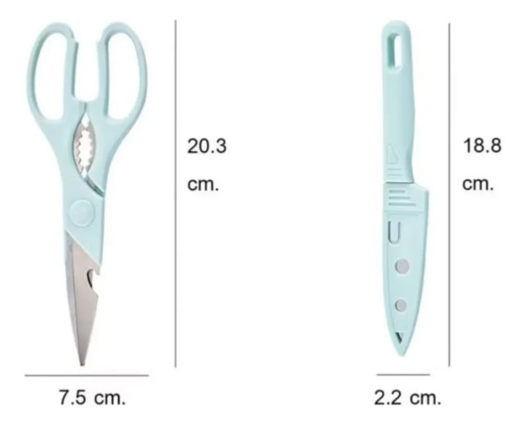 • Dimensões: Tábua 25x18 cm | Tesoura 20x7,5 cm | Faca 18x2 cm | Descascador 13x7,7 cm
